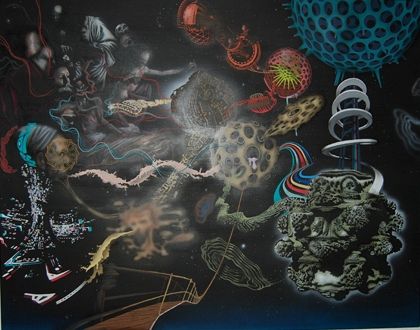 Ida Kvetnys malerier er også organiske og fylder hele fladen ud med figurer, der vækker mindelser om indianske totemmer og tegn, som samtidig modsvares af en tegneserieagtig science fiction fra computerspillets digitale rodnet.