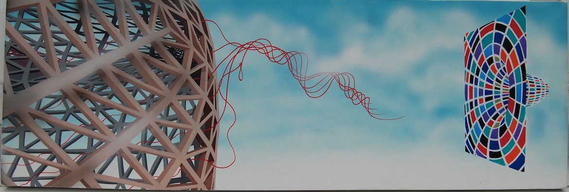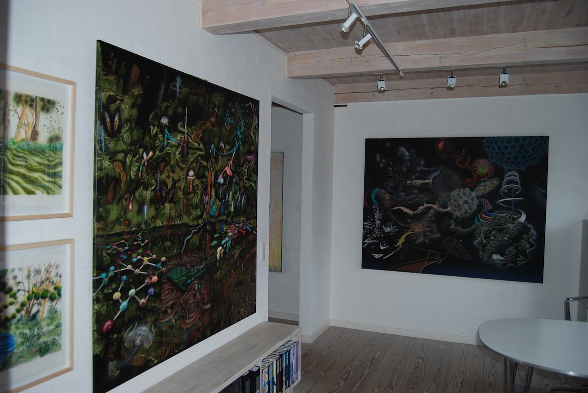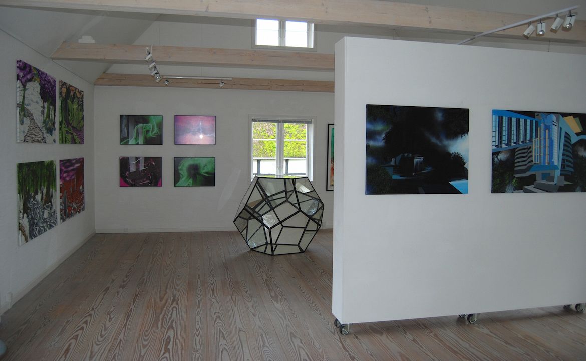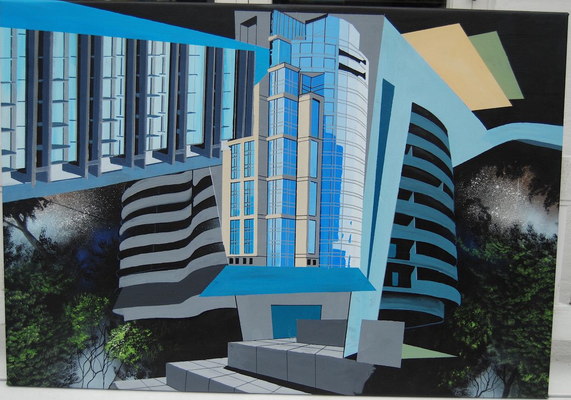 Kristian Vodder Svensson har ligeledes begge sider i sine malerier på lærred, hvor futuriske, urbane landskaber, hulter til bulter, møder de tågede og eventyrlige landskaber.